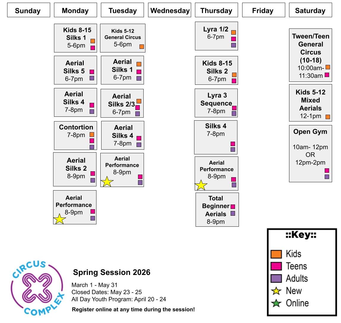 Classes are billed by semester and prorated for the exact number of classes occurring. Students are auto-enrolled for subsequent semesters once registering. If you’d like to remove yourself from a class, please email us at Info@CircusComplex.com. If our classes are not affordable for you or your family, please reach out to our Financial Aid Program and we will find a solution that works for your unique situation.